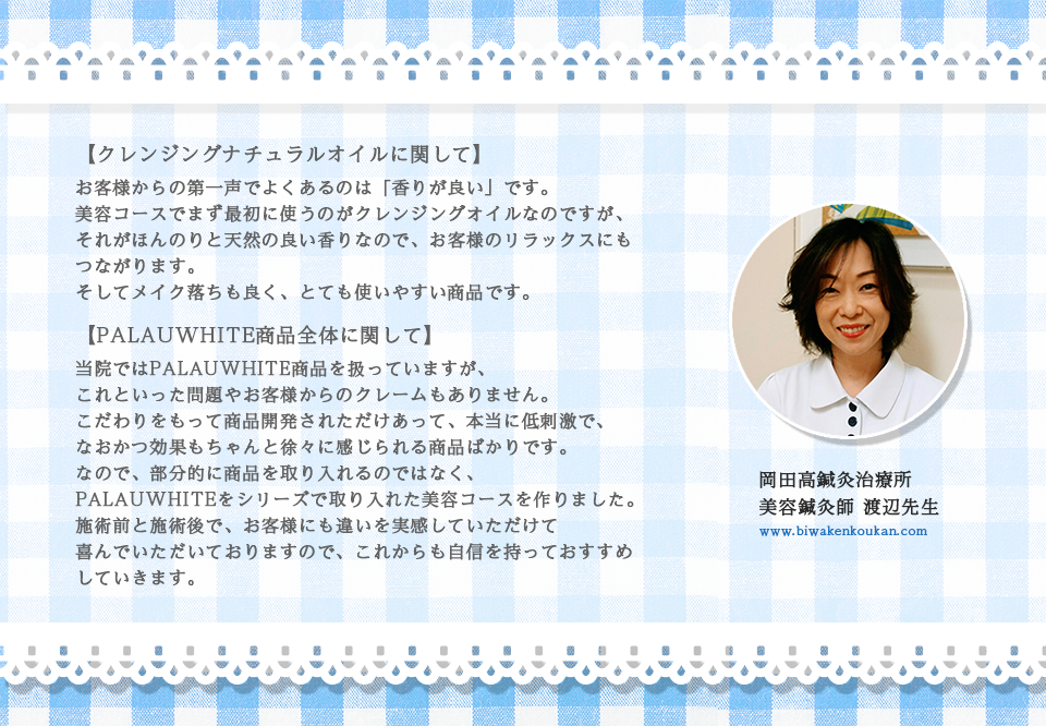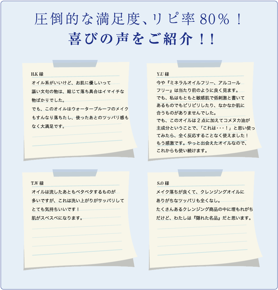 ●コメヌカ油 ○ヤシ油脂肪酸PEG-7グリセリル ●スクワラン ○オレイルアルコール ●ヒマワリ種子油 ●パラオ白泥抽出物 ●チオ硫酸Na ●マカデミア種子油 ●ホホバ種子油 ●コメ胚芽油 ●シア脂油 ●メドゥフォーム油 ●ヘーゼルナッツ種子油 ●アーモンド油 ●ブドウ種子油 ●アボガド油 ●ツバキ種子油 ●月見草油 ●コーン油 ●カニナバラ果実油 ●ラベンダー油 ●パルミチン酸レチノール ●テトラヘキシルデカン酸アスコルビル ●トコフェロール