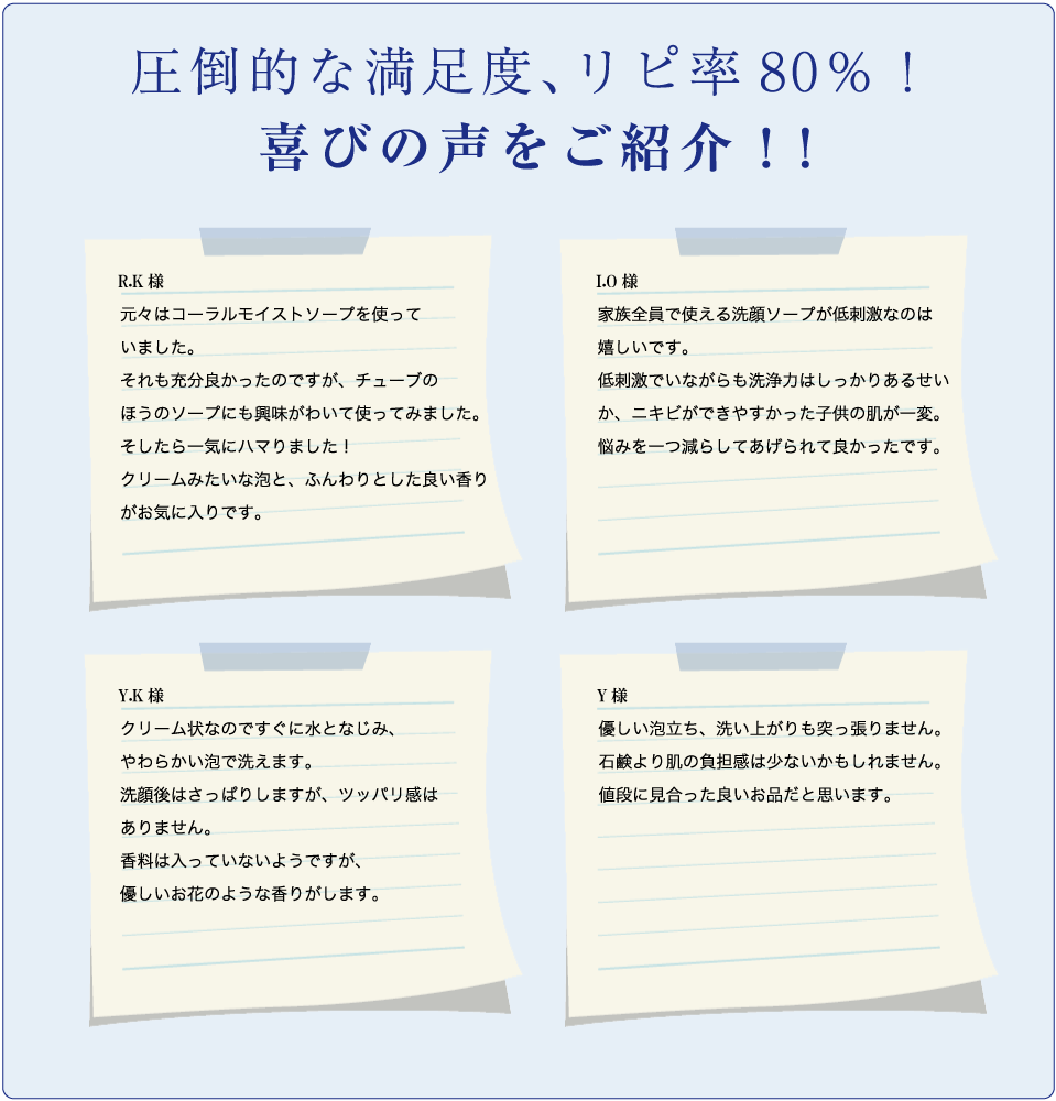 石鹸を作る脂肪酸を刺激の少ないミリスチン酸とステアリン酸に絞った、こだわりの石鹸です。