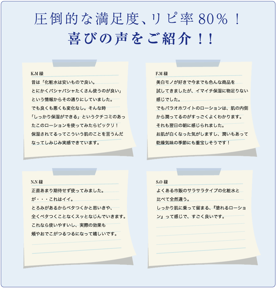 パラオ白泥抽出物の他、オタネニンジン根エキス、オウゴン根エキス、カンゾウ根エキス、ユズ果実エキスなどの植物性エキスやローヤルゼリーエキス、サッカロミセスセレビシアエキス、ポリクオタニウム-51、PCA-Na、メチルグルセス-10などの機能性原料が保湿力を発揮します。さらに8種類のアミノ酸がお肌を整えます
