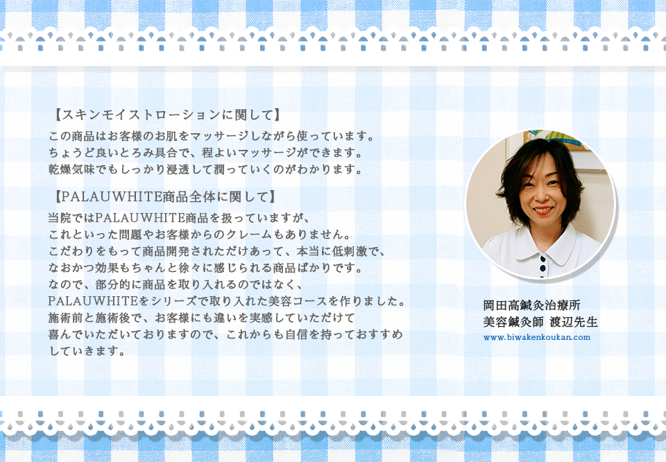 洗顔の後、適量を手のひらに取り、包み込むような気持ちで顔全体につけて下さい。